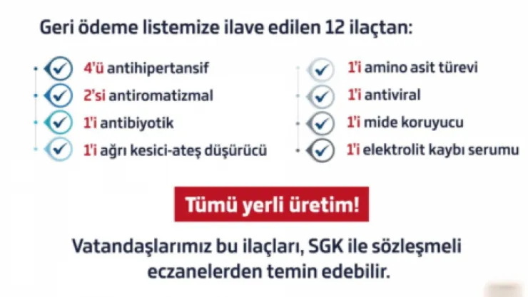 Çalışma ve Sosyal Güvenlik Bakanı Vedat Işıkhan, sosyal medya hesabından yapmış olduğu paylaşım ile tamamı yerli üretim olmak üzere 12 ilacın daha geri ödeme listesine alındığını duyurdu. Işıkhan, “Sosyal Güvenlik Kurumumuzun düzenlemesiyle tamamı yerli üretim olmak üzere 12 ilacı daha geri ödeme listesine aldık. İlaçların hastalarımıza şifa olmasını temenni eder, vatandaşlarımıza sağlıklı bir ömür dilerim” ifadelerini kullandı.