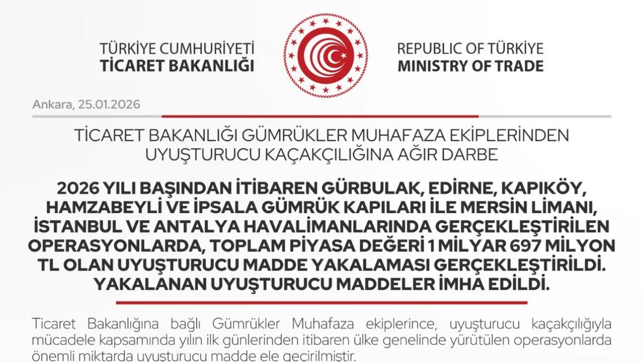 Ticaret Bakanlığı Gümrükler Muhafaza ekipleri tarafından 2026 yılı başından itibaren 378,9 kilogram esrar, 117,4 kilogram sentetik hap, 225,5 kilogram metamfetamin, 280 bin adet metadon hap, 7,6 kilogram afyon sakızı ve 3,1 kilogram kokain olmak üzere toplam değeri 1 milyar 697 milyon lira olan uyuşturucu madde yakalaması gerçekleştirildi. Yakalanan uyuşturucu maddeler imha edildi. Şüpheliler hakkında ise gerekli adli işlemler yapıldı.