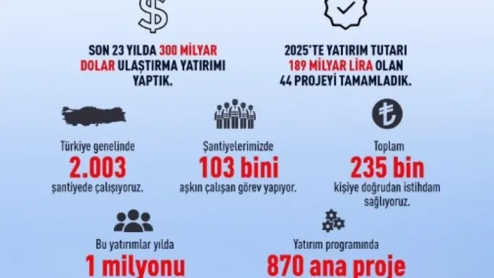 Ulaştırma ve Altyapı Bakanı Abdulkadir Uraloğlu 2025 yılı için yapılan projelerden ile ilgili açıklamalarda bulunarak: '2025'te yatırım tutarı 189 Milyar TL olan 44 projeyi tamamladık' dedi.