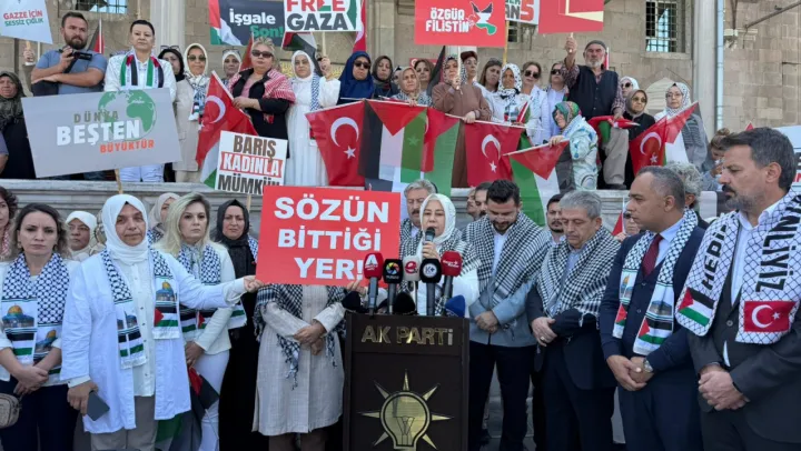 Programda konuşan AK Parti Kayseri Kadın Kolları İl Başkanı Meral Koşar, 'Duvarlara kanla yazılmış isimler, bir annenin, bir babanın yitik hayali, bir çocuğun hiç göremeyeceği baharı, bir bebeğin hiç yaşayamayacağı çocukluğu; İşte bu acının adı: Gazze. Bugün kadınlar olarak Gazze'nin sessiz çığlığına ses olmak için el ele verdiğimiz tüm dünyaya göstermek adına meydanlardayız. Bugün 81 ilde kurduğumuz bu zincir, Gazze'de evlatlarını kaybeden anne-babaların zinciridir. Öksüz-yetim bırakılan çocukların zinciridir ve insanlığını kaybetmeyen herkesin zinciridir. Biz; 'Yaralıları mı kurtaracaktım, şehitleri mi taşıyacaktım ya da bir torba un mu bulmaya çalışacaktım? Yemin ederim eve tek bir torba un getirip, çocuklarımın karnının doyacağını bilsem, ölüme razı olurum' diyen Gazzeli annenin sesi olmak için, bu sesi dünyaya duyurmak için buradayız. Bu zulmü görmezden gelen herkese soruyorum: Kalbiniz nerede? Barışçıl bir şekilde yola çıkan ve uluslararası sularda haydut İsrail'in hukuksuz müdahalesine uğrayan Küresel Sumud Filosu'nun dünya öylece seyretti. Hamdolsun, Türkiye, Cumhurbaşkanımız Sayın Recep Tayyip Erdoğan'ın kararlılığıyla bu adaletsizlik karşısında da sessiz kalmadı. Sadece kendi ülkesinin vatandaşlarını değil, 13 ülkeden 101 vicdan sahibi gönüllünün de ülkelerine güvenle dönmelerini sağladı. Bizler de ablukayı delmek ve insanlık onurunu korumak için mücadele eden kahramanların ülkemize dönüşlerinde oradaydık. Hepsinin dilinde aynı temenni vardı: 'Biz elimizden geleni yaptık, umarım Gazze'ye bir umut ışığı olabilmişizdir.' Biz bugün bütün kimliklerimizden sıyrılarak sadece kadın kimliğimizle buradayız. Çünkü bu mesele ne dünyadaki rollerimizle, ne taşıdığımız unvanlarla, ne de sahip olduklarımızla ilgilidir; bu mesele insanlık meselesidir. Bugün Türkiye'den tüm dünyaya tek bir şey söylüyoruz: Barış kadınla mümkündür. Slogan atmıyoruz; vicdanlarımızla haykırıyoruz. Çünkü bazı sessizlikler vardır ki, arşı yere indirir. Ve bizim sessizliğimiz, Gazze'nin en gür çığlığı olacaktır' diye konuştu.