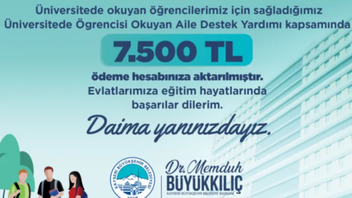 Kayseri Büyükşehir Belediyesi, 'Üniversitede Öğrencisi Okuyan Aile Destek Yardımı' projesi kapsamında 2.697 aileye toplam 20 milyon 227 bin 500 TL destek ödemesi gerçekleştirdi. Her bir ihtiyaç sahibi aileye 7.500 TL tutarında yardım yapıldı.