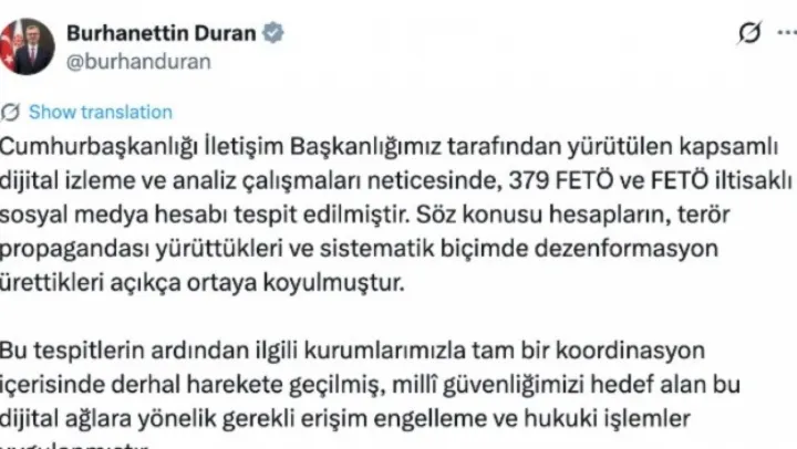 Duran, 'Cumhurbaşkanlığı İletişim Başkanlığımız tarafından yürütülen kapsamlı dijital izleme ve analiz çalışmaları neticesinde, 379 FETÖ ve FETÖ iltisaklı sosyal medya hesabı tespit edilmiştir. Söz konusu hesapların, terör propagandası yürüttükleri ve sistematik biçimde dezenformasyon ürettikleri açıkça ortaya koyulmuştur.Bu tespitlerin ardından ilgili kurumlarımızla tam bir koordinasyon içerisinde derhal harekete geçilmiş, millî güvenliğimizi hedef alan bu dijital ağlara yönelik gerekli erişim engelleme ve hukuki işlemler uygulanmıştır. Cumhurbaşkanımız Sayın Recep Tayyip Erdoğan'ın liderliğinde Türkiye, terörle mücadelesini yalnızca sahada değil, dijital platformlarda da kararlılıkla sürdürmektedir. Hiçbir terör örgütüne, uzantılarına ve algı operasyonlarına dijital alanlar da dahil olmak üzere asla müsamaha gösterilmeyecektir' ifadelerini kullandı.