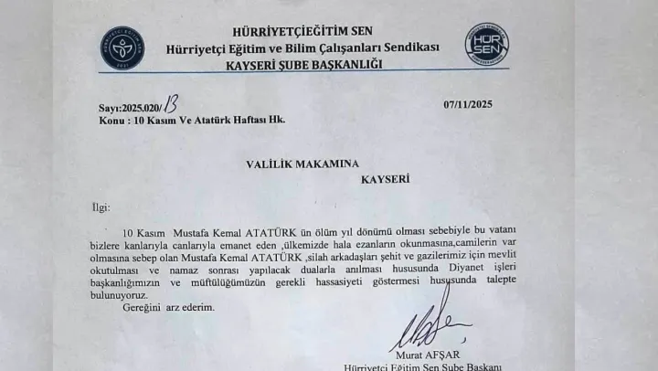 Kayseri Hürriyetçi Eğitim Sendikası, Kayseri Valiliğine dilekçe ile 10 Kasım 2025 tarihinde Camilerde Mustafa Kemal Atatürk, şehitler ve gaziler için mevlit okutulmasını ve namaz sonrası yapılacak dualarla anılması için talepte bulundu.