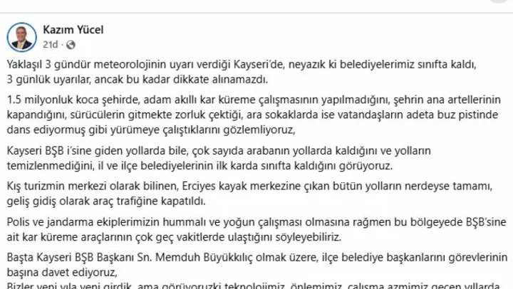 İYİ Parti Genel İdare Kurulu (GİK) Üyesi Kazım Yücel, sosyal medya hesabından yapmış olduğu paylaşımda belediyelerin kar küreme çalışmalarında sınıfta kaldığını ifade ederek, 'Yaklaşık 3 gündür meteorolojinin uyarı verdiği Kayseri'de, ne yazık ki belediyelerimiz sınıfta kaldı, 3 günlük uyarılar, ancak bu kadar dikkate alınamazdı. 1 buçuk milyonluk koca şehirde, adam akıllı kar küreme çalışmasının yapılmadığını, şehrin ana artellerinin kapandığını, sürücülerin gitmekte zorluk çektiği, ara sokaklarda ise vatandaşların adeta buz pistinde dans ediyormuş gibi yürümeye çalıştıklarını gözlemliyoruz, Kayseri Büyükşehir Belediyesine giden yollarda bile, çok sayıda arabanın yollarda kaldığını ve yolların temizlenmediğini, il ve ilçe belediyelerinin ilk karda sınıfta kaldığını görüyoruz. Kış turizmin merkezi olarak bilinen, Erciyes kayak merkezine çıkan bütün yolların nerdeyse tamamı, geliş gidiş olarak araç trafiğine kapatıldı. Polis ve jandarma ekiplerimizin hummalı ve yoğun çalışması olmasına rağmen bu bölgeye de Büyükşehir Belediyesine ait kar küreme araçlarının çok geç vakitlerde ulaştığını söyleyebiliriz. Başta Kayseri Büyükşehir Bele Başkanı Sn. Memduh Büyükkılıç olmak üzere, ilçe belediye başkanlarını görevlerinin başına davet ediyoruz, Bizler yeni yıla yeni girdik, ama görüyoruz ki teknolojimiz, önlemimiz, çalışma azmimiz geçen yıllarda kalmış' ifadelerinde bulundu.