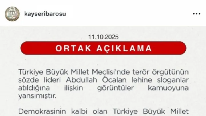 Kayseri Barosu tarafından ortak açıklama kapsamında yapılan açıklamada, 'Türkiye Büyük Millet Meclisi'nde terör örgütünün sözde lideri Abdullah Öcalan lehine sloganlar atıldığına ilişkin görüntüler kamuoyuna yansımıştır. Demokrasinin kalbi olan Türkiye Büyük Millet Meclisi çatısı, millet iradesinin tecelligâhıdır. Bu çatı altında, binlerce şehidimizin aziz hatırasını inciten hiçbir tutum ve söylem kabul edilemez.
