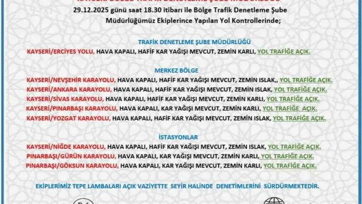 Kayseri İl Emniyet Müdürlüğü Bölge Trafik Denetleme Şube Müdürlüğü ekiplerince yapılan yol kontrolleri sonucunda merkez ve çevre ilçelerde yolların açık olduğu bildirildi.