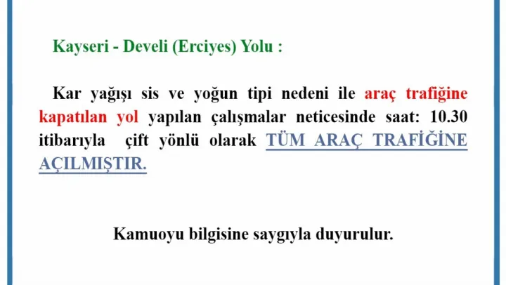 Kayseri İl Emniyet Müdürlüğü Trafik Denetleme Şube Müdürlüğü'nün hava ve yol durumu hakkında yapmış olduğu bilgilendirmelere göre; Kar yağışı, sis ve yoğun tipi nedeniyle araç trafiğine kapatılan Kayseri-Develi yolu, yapılan çalışmalar neticesinde saat 10.30 itibarıyla çift yönlü olarak tüm araç trafiğine açıldı.