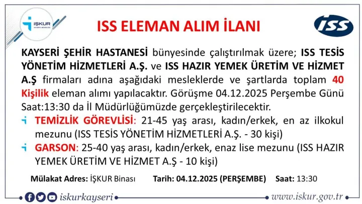 İŞKUR Kayseri tarafından Kayseri Şehir Hastanesi'ne 40 kişilik personel alımı yapılacağı duyuruldu. Toplu görüşme 4 Aralık 2025 Perşembe günü saat: 13:30'da İŞKUR Kayseri İl Müdürlüğü'nde gerçekleşecek. Temizlik görevlisi olarak 30 kişi, garson olarak 10 kişi kontenjan belirlendi.