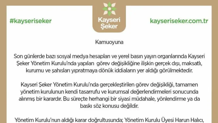 Yapılan açıklamada ise görev değişikliğinin siyasi bir karar olmadığı vurgulanarak, 'Son günlerde bazı sosyal medya hesapları ve yerel basın yayın organlarında Kayseri Şeker Yönetim Kurulu'nda yapılan görev değişikliğine ilişkin gerçek dışı, maksatlı, kurumu ve şahısları yıpratmaya dönük iddiaların yer aldığı görülmektedir. Kayseri Şeker Yönetim Kurulu'nda gerçekleştirilen görev değişikliği, tamamen yönetim kurulunun kendi tasarrufu ve kurumsal değerlendirmeleri sonucunda alınmış bir karardır. Bu süreçte herhangi bir siyasi müdahale, yönlendirme ya da baskı söz konusu değildir. Yönetim Kurulu'nun aldığı karar doğrultusunda; Yönetim Kurulu Üyesi Harun Halıcı, Yönetim Kurulu Başkanlığı görevine getirilmiştir. Söz konusu değişiklik, idari bir tasarruftur. Bazı mecralarda yer alan, çalışanlar arasında ayrımcılık yapıldığı veya belirli gruplara yönelik baskı uygulandığı yönündeki iddialar ise tamamen asılsızdır. Bu tür haber ve yorumlar, kurumun itibarını zedelemeye, birlik ve bütünlüğünü bozmaya yönelik sorumsuz ve gerçek dışı değerlendirmelerden ibarettir. Kayseri Şeker; kurumsal, şeffaf, denetlenebilir, hesap verilebilir, halka açık kuruluş olarak Türkiye'nin, Orta Anadolu'nun ve şeker sektörünün uluslararası standartlarda ve değerde gözde bir çiftçi kuruluşudur. Bu güzide kuruluşu, basit hevesleri ve kişisel çıkarları uğruna zedelemek isteyenlere fırsat vermemek, her sorumluluk sahibi kişinin görevidir. Ayrıca şunu da belirtmeliyiz ki; Kayseri Şeker bütün çalışanlarını büyük Kayseri Şeker Ailesi'nin değerli bir mensubu olarak görmekte ve bu anlayışla hepsine eşit mesafede duruş sergileyerek, iş barışının ve kurumsal huzurun korunmasında azami gayreti göstermektedir.Kamuoyunun doğru bilgilendirilmesi adına bu açıklama zorunlu hale gelmiştir' denildi.