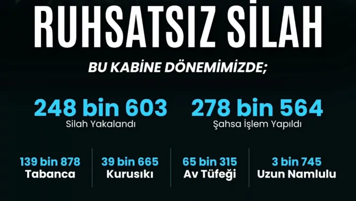 Bakan Yerlikaya, 'Ruhsatsız silahı yalnızca bir 'yasa ihlali' olarak değil, toplumsal huzura yönelik ciddi bir tehdit unsuru olarak görüyoruz. Bu kabine dönemimizde düzenlenen operasyonlarımızda toplam; 139 bin 878 adet ruhsatsız tabanca, 39 bin 665 adet kurusıkıdan çevrilme tabanca, 65 bin 315 adet ruhsatsız av tüfeği ve 3 bin 745 uzun namlulu silah olmak üzere toplam 248 bin 603 adet silah ele geçirildi. 278 bin 564 şüpheli hakkında işlem yapıldı' ifadelerini kullandı.