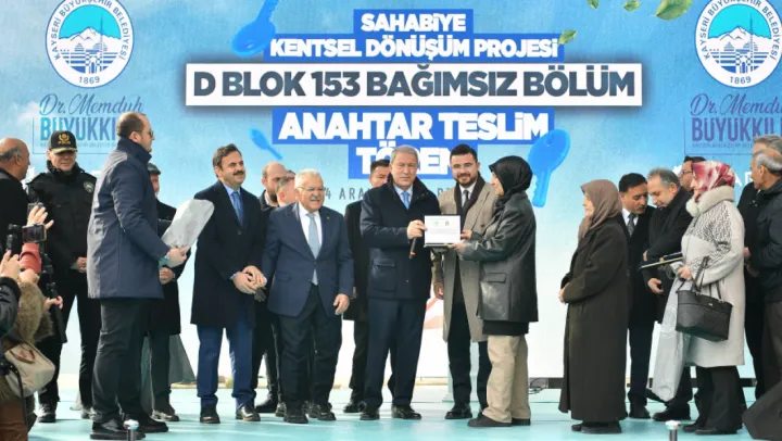 Kayseri'nin en kapsamlı kentsel dönüşüm hamlelerinden biri olan Sahabiye Kentsel Dönüşüm Projesi'nde önemli bir aşama daha kaydedilirken proje kapsamında, 1'inci Etap D Blok'ta yapımı tamamlanan 144 konut ve 9 işyeri olmak üzere toplam 153 bağımsız bölümün anahtarları hak sahiplerine teslim edildi.