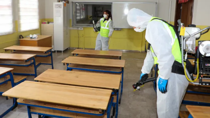 Talas genelindeki eğitim kurumlarının tatile girmesiyle birlikte kolları sıvayan Talas Belediyesi temizlik ekipleri, okulların kazan daireleri başta olmak üzere tuvaletler, lavabolar ve sınıflar ile koridorlarda dezenfekte ve hijyen çalışması gerçekleştiriyor.