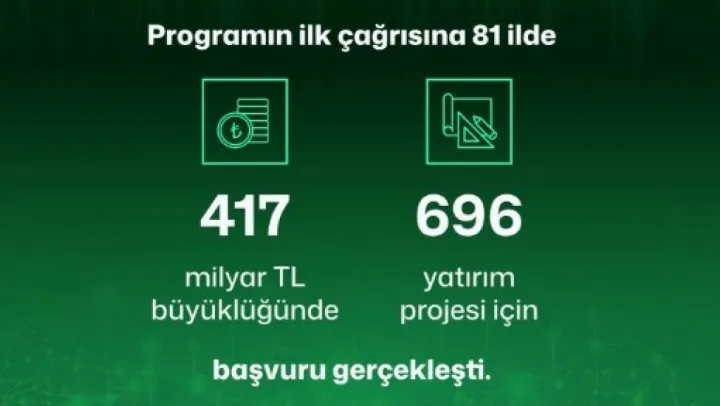Sanayi ve Teknoloji Bakanı Mehmet Fatih Kacır, sosyal medya hesabından yaptığı paylaşımda, her ilde 4 öncelikli yatırım konusuna güçlü teşvikler sunduklarını belirterek, programın ilk çağrısına 81 ilin tamamından 417 milyar TL'yi aşan yatırım tutarına sahip 696 proje başvurusu yapıldığını bildirdi. Bakan Kacır, 'Nihai fizibilite çalışmalarının ardından destekleyeceğimiz projelerle, şehirlerimizde yeni istihdam alanları oluşturacak, üretimi teşvik edecek, illerimizin sosyoekonomik gelişmişlik seviyesini yükselteceğiz' ifadelerini kullandı.