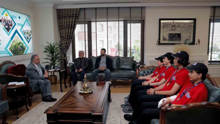 Başkanlık makamındaki ziyarete 50. Yıl Dedeman Fen ve Teknoloji Anadolu İmam Hatip Lisesi Müdürü Ahmet Oğuz, öğretmen Can Evren Yıldız ve yarışmada dereceye giren öğrenciler Ertuğrulhan Yağmur, Ahmet Taha Demir, Fikri Eren Yıldırım ve Beşir Yasin Kalın katıldı.