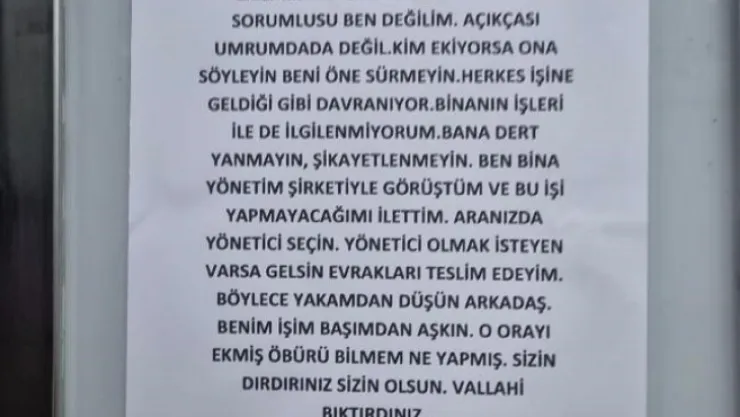 Kayseri’de bir bina yöneticisi, bina sakinlerine isyanını bina içerisindeki cama astığı kağıtla gösterdi. Kağıda yazdıklarıyla adeta içini döken bina yöneticisi, görevini bırakacağını ve artık binanın işleriyle uğraşmaktan sıkıldığını söyledi. Yönetici, güldüren isyanını kağıda döktüğü şu sözlerle ifade etti: