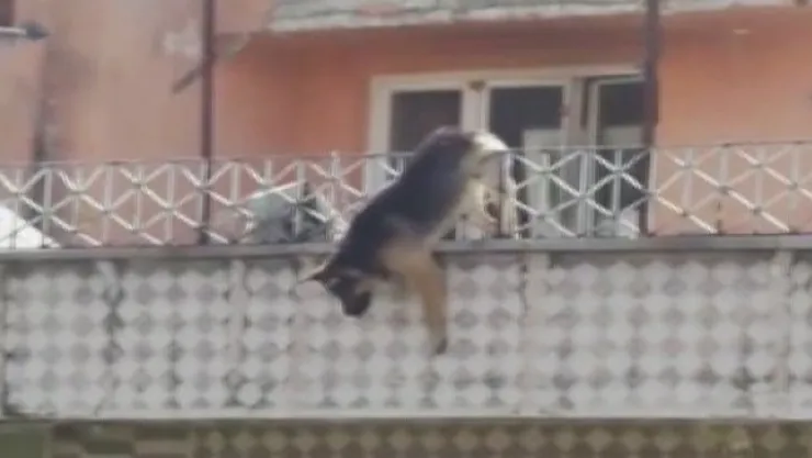 Kayseri'de sahibi tarafından balkon demirlerine zincirle bağlanan 'Garip' isimli K9 cinsi köpek, balkondan aşağı düşmesi sonrası asılı kalarak can verdi.