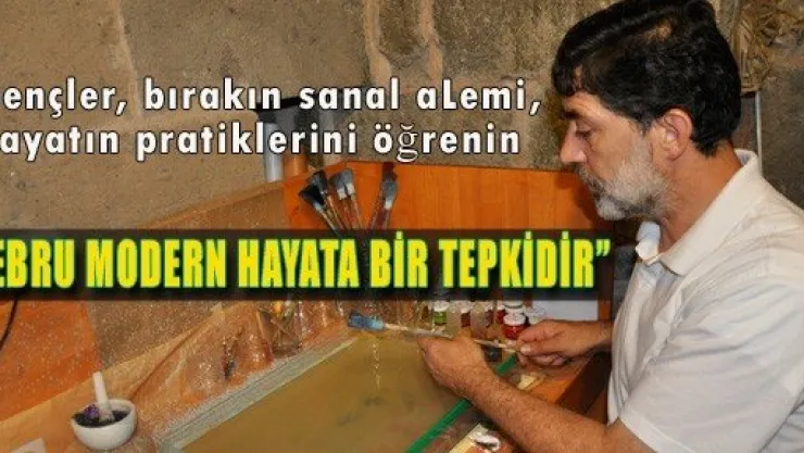 Hunat Hatun Kültür Merkezi'nde ebru sanatını icra eden Ebru sanatçısı Ahmet Kurt, Ebrunun modern hayatın insanlara dayattığı hızlı yaşama bir tepki olduğunu söylüyor.