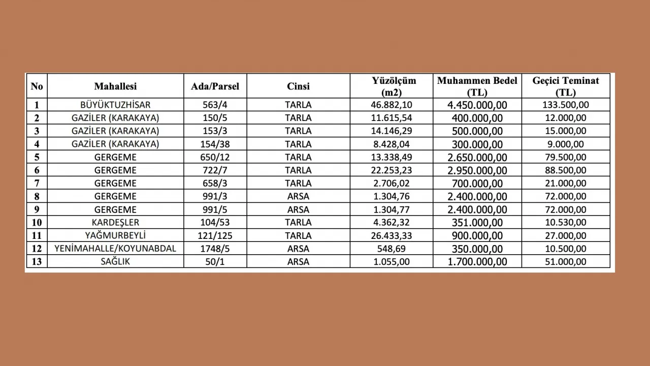 Bünyan Belediyesi, mülkiyetinde bulunan 13 adet taşınmazın açık teklif usulü ile tek tek satılacağını duyurdu. Büyüktuzhisar, Gaziler, Gergeme, Kardeşler, Yağmurbeyli, Yenimahalle/Koyunabdal ve Sağlık mahallelerinde kiraya verilecek 9 tarla ve 4 arsa için belirlenen muhammen bedelleri ise 300 bin TL ile 4 milyon 450 bin TL arasında değişkenlik gösteriyor. İhale, 10 Aralık 2025 Çarşamba günü saat 16.00’da Bünyan Belediyesi Toplantı Salonu’nda 2886 sayılı Devlet İhale Kanunu'nun 45. maddesine istinaden açık teklif usulü ile tek tek satılacak.