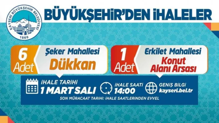 Kayseri Büyükşehir Belediyesi tarafından Kocasinan İlçesi Erkilet Mahallesi’nde bulunan 1 adet konut alanı arsası ve Şeker Mahallesi’nde bulunan 6 adet dükkân ile Melikgazi İlçesi Yeşilyurt Mahallesinde bulunan Akaryakıt ve Servis İstasyonu arsası ihale ile satılacak.