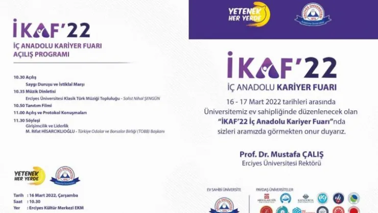 Cumhurbaşkanlığı İnsan Kaynakları Ofisi koordinasyonunda yetenek her yerde temasıyla 2019 yılında başlatılan Bölgesel kariyer fuarları kapsamında İç Anadolu Kariyer Fuarı (İKAF'22) Erciyes Üniversitesi (ERÜ) ev sahipliğinde düzenlenecek. 2 gün boyunca devam edecek olan etkinliklerde öğrenciler, sektör temsilcileri ile bir araya gelerek staj ve iş imknı ile kariyer planlarına önemli katkılar sağlayacak.