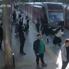 Cumhuriyet Meydanı Raylı Sistem İstasyonu’nda karşıya geçmek isteyen genç bir yolcu, kulaklık taktığı için yaklaşan tramvayı fark etmedi. O esnada görev başında olan güvenlik personelinin hızlı refleksi sayesinde genç yolcu raylara girmeden son anda durdurularak olası bir kazadan kurtarıldı.