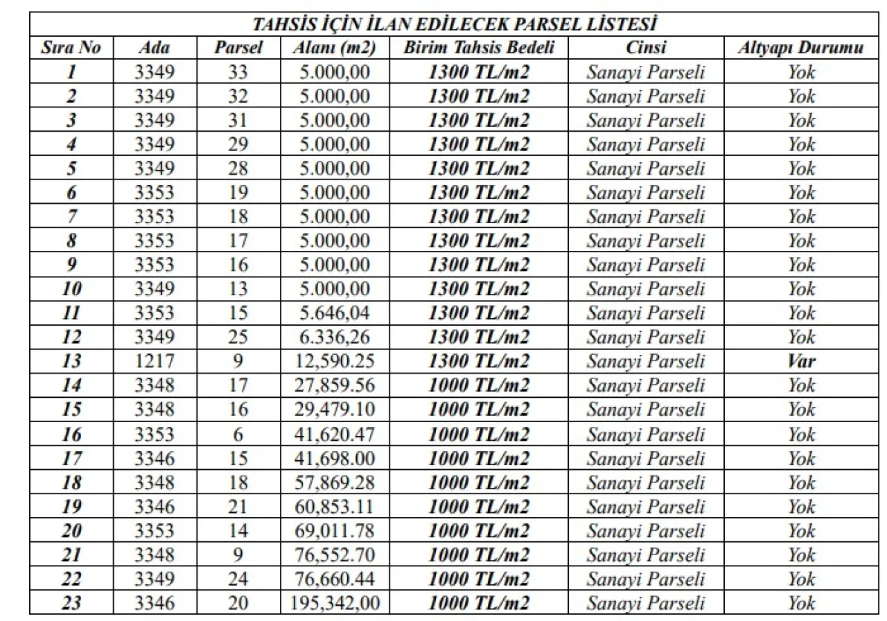 İncesu OSB’de tahsisi yapılacak olan arsaların birim tahsis bedeli metrekare fiyatı bin TL’den bin 300 TL arasında değişkenlik gösteriyor. Ayrıca, 23 parselin ayrı ayrı alanları ise 5 bin metrekareden 195 bin metrekareye kadar değişiyor.