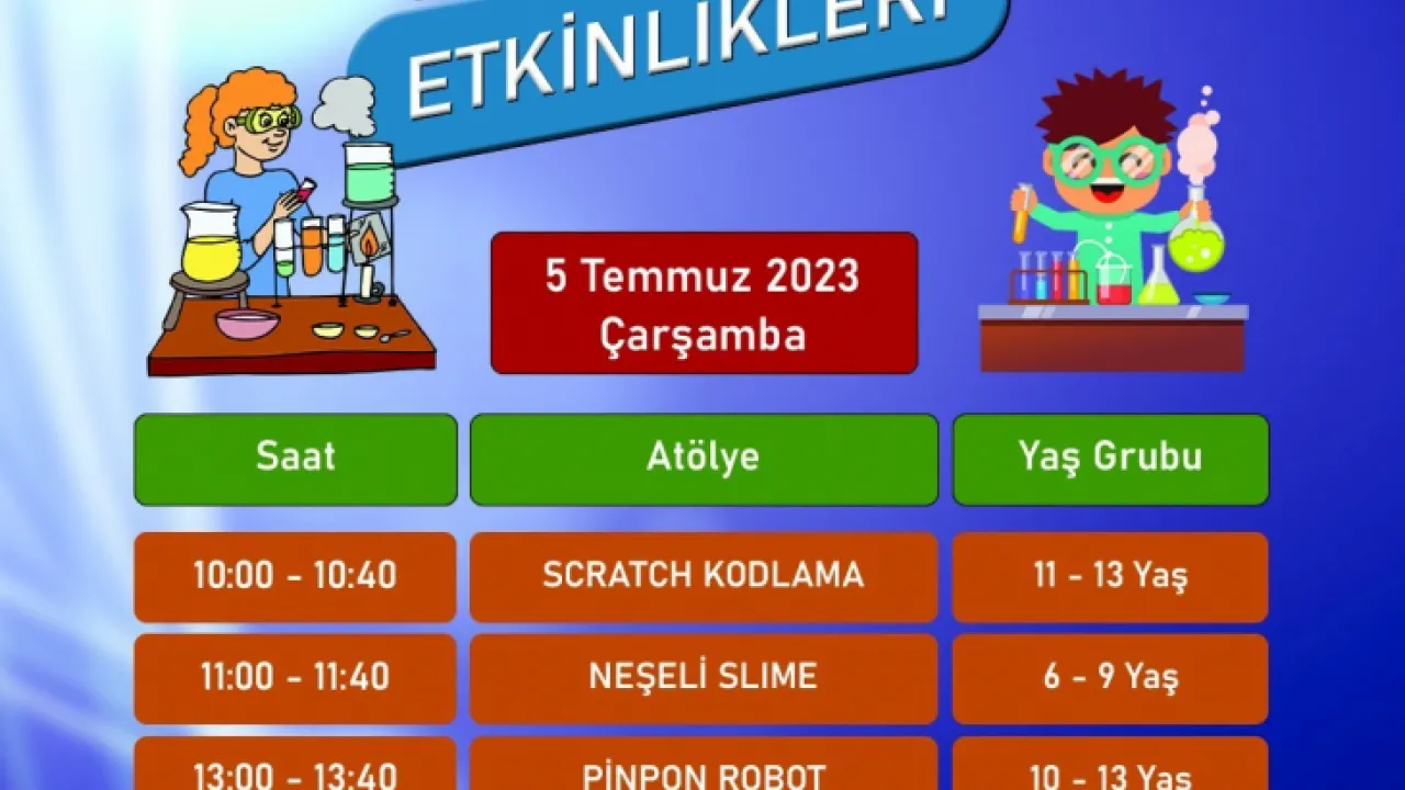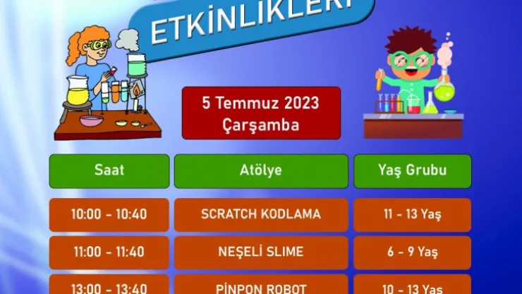 6 ila 15 yaş arası çocukların yararlanacağı etkinlikler kapsamında 4-7 Temmuz tarihleri arasında geri dönüşüm, ahşap atölyesi, güneş gözlemi, boncuk kodlama gibi birbirinden eğlenceli faaliyetler gerçekleştirilecek.