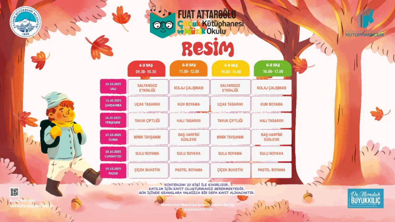 14 Ekim Salı günü başlayacak olan atölyeler, 19 Ekim Pazar günü sona erecek. 4-8 yaş arası çocukların katılabileceği bu etkinlikler, sosyal etkileşim ve keyifli vakit geçirme imkanı sunarak, ailelerin de ilgisini çekiyor. Kayıtlar için [buraya](https://basvuru.kayseri.bel.tr/) tıklayarak online işlem yapılabilir.