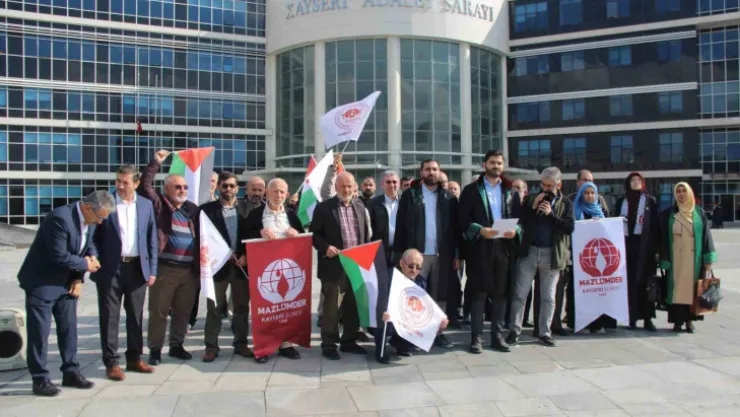 İnsan Hakları ve Mazlumlar İçin Dayanışma Derneği (MAZLUMDER) Kayseri Şubesi üyeleri, İsrail'in Filistin'e yaptığı saldırılar nedeniyle Kayseri Adliyesi'ne suç duyurusunda bulundu.