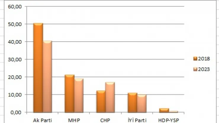 MHP ve İyi Parti milletvekilleri 2018 seçimlerinde kazanan aynı isimlerden oluşurken, Ak Parti'nin milletvekili sayısı bir eksilirken oran olarak %10'luk bir oy kaybına uğradı.