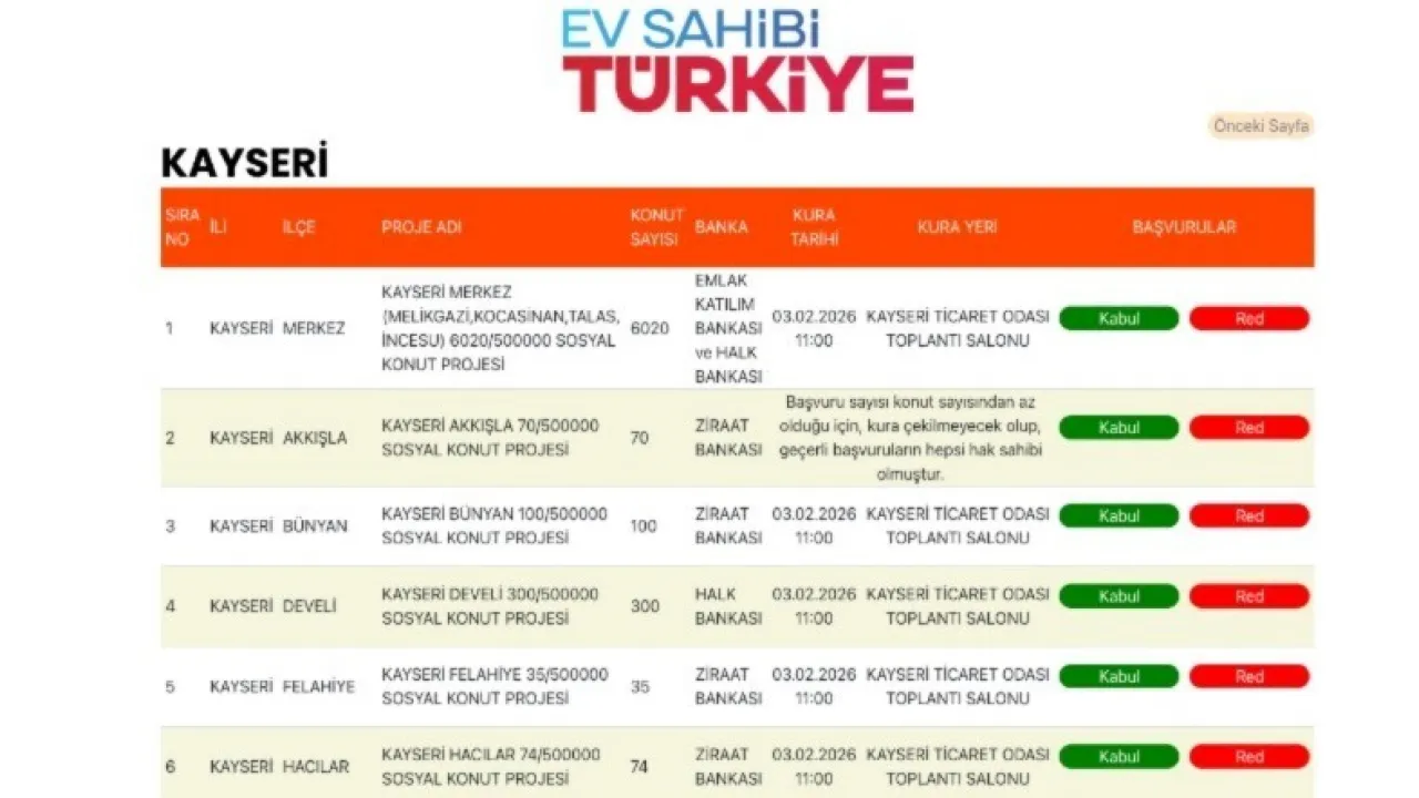 Yüzyılın Konut Projesi; 500 bin sosyal konut kapsamında Kayseri’ye 7 bin 562 konut inşa edilecek. TOKİ çekiliş sonrası sonuçlar e-Devlet ve TOKİ'nin kendi sayfası üzerinden yayınlanacak. Kayseri için kura çekiliş tarihi 3 Şubat olarak açıklandı. Kura, bugün Kayseri Ticaret Odası Toplantı Salonu'nda saat 11:00'de yapılacak.