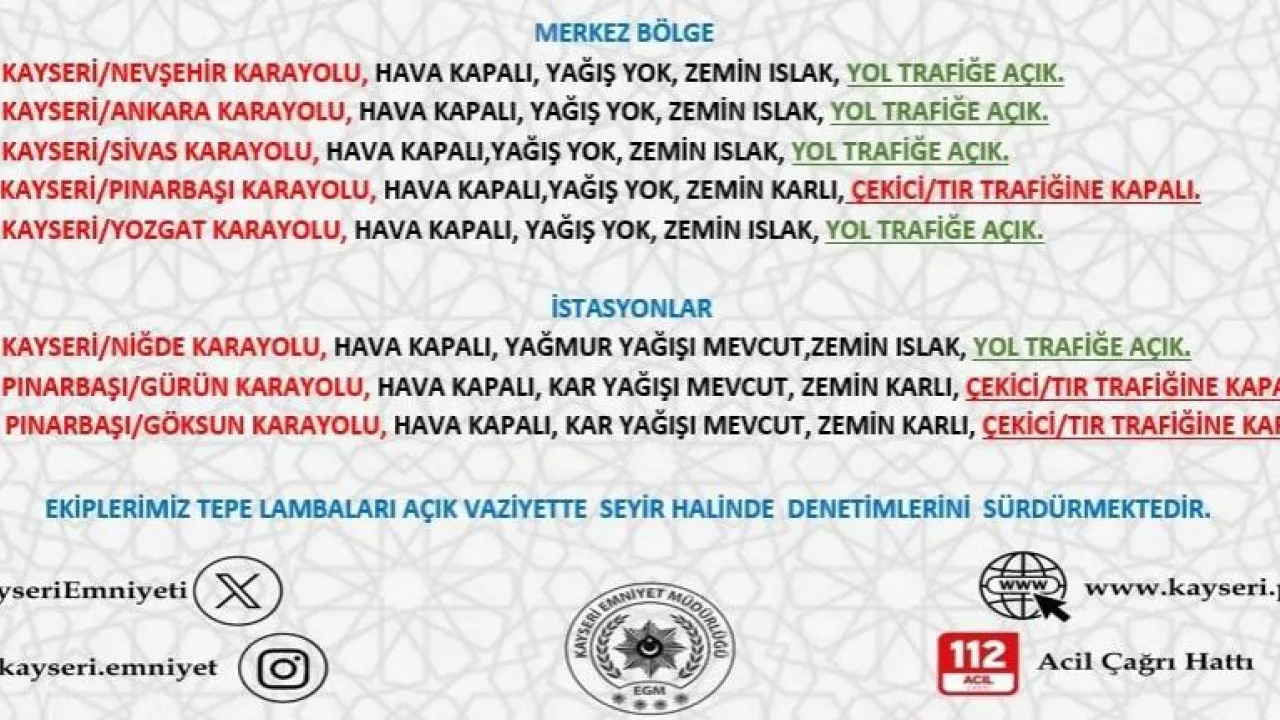 Kayseri İl Emniyet Müdürlüğü Bölge Trafik Denetleme Şube Müdürlüğü ekiplerince yol kontrolleri gerçekleştiriliyor. Bu kapsamda kontroller sonucunda merkez ve çevre ilçelerde bazı yolların açık bazı yolların ise çekici/tır trafiğine kapalı olduğu bildirildi.