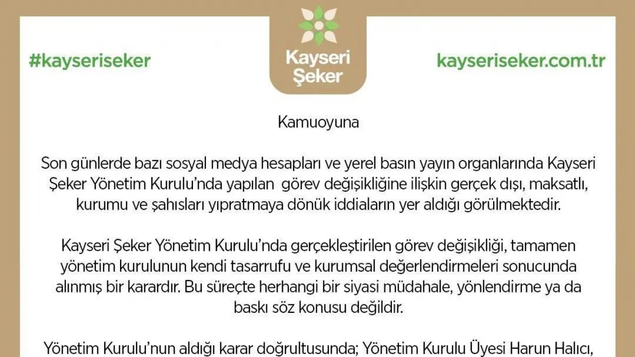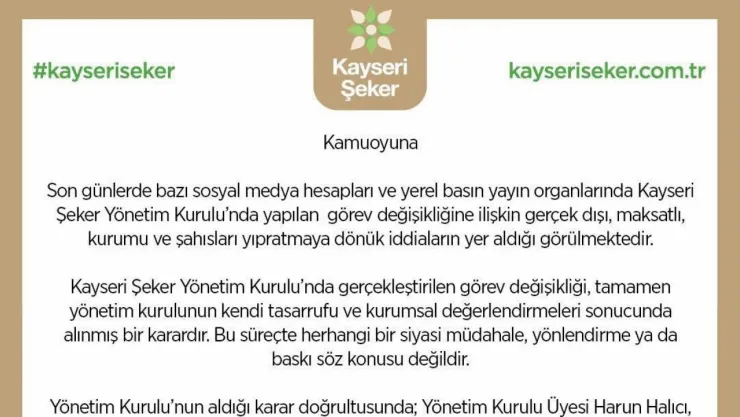 Yapılan açıklamada ise görev değişikliğinin siyasi bir karar olmadığı vurgulanarak, “Son günlerde bazı sosyal medya hesapları ve yerel basın yayın organlarında Kayseri Şeker Yönetim Kurulu’nda yapılan görev değişikliğine ilişkin gerçek dışı, maksatlı, kurumu ve şahısları yıpratmaya dönük iddiaların yer aldığı görülmektedir. Kayseri Şeker Yönetim Kurulu’nda gerçekleştirilen görev değişikliği, tamamen yönetim kurulunun kendi tasarrufu ve kurumsal değerlendirmeleri sonucunda alınmış bir karardır. Bu süreçte herhangi bir siyasi müdahale, yönlendirme ya da baskı söz konusu değildir. Yönetim Kurulu’nun aldığı karar doğrultusunda; Yönetim Kurulu Üyesi Harun Halıcı, Yönetim Kurulu Başkanlığı görevine getirilmiştir. Söz konusu değişiklik, idari bir tasarruftur. Bazı mecralarda yer alan, çalışanlar arasında ayrımcılık yapıldığı veya belirli gruplara yönelik baskı uygulandığı yönündeki iddialar ise tamamen asılsızdır. Bu tür haber ve yorumlar, kurumun itibarını zedelemeye, birlik ve bütünlüğünü bozmaya yönelik sorumsuz ve gerçek dışı değerlendirmelerden ibarettir. Kayseri Şeker; kurumsal, şeffaf, denetlenebilir, hesap verilebilir, halka açık kuruluş olarak Türkiye’nin, Orta Anadolu’nun ve şeker sektörünün uluslararası standartlarda ve değerde gözde bir çiftçi kuruluşudur. Bu güzide kuruluşu, basit hevesleri ve kişisel çıkarları uğruna zedelemek isteyenlere fırsat vermemek, her sorumluluk sahibi kişinin görevidir. Ayrıca şunu da belirtmeliyiz ki; Kayseri Şeker bütün çalışanlarını büyük Kayseri Şeker Ailesi’nin değerli bir mensubu olarak görmekte ve bu anlayışla hepsine eşit mesafede duruş sergileyerek, iş barışının ve kurumsal huzurun korunmasında azami gayreti göstermektedir.Kamuoyunun doğru bilgilendirilmesi adına bu açıklama zorunlu hale gelmiştir” denildi.