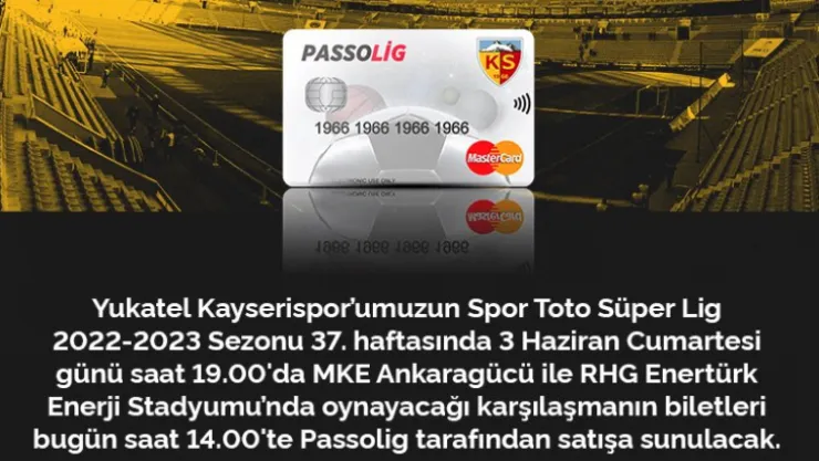 Kayserispor Süper Ligin 37’nci haftasında Ankaragücü’nü konuk edecek. Bu müsabakanın biletleri satışa çıktı. Kulüpten yapılan açıklamada, "Kayserispor’umuzun Spor Toto Süper Lig 2022-2023 Sezonu 37. haftasında 3 Haziran Cumartesi günü saat 19.00'da MKE Ankaragücü ile RHG Enertürk Enerji Stadyumu’nda oynayacağı karşılaşmanın biletleri bugün saat 14.00'te Passolig tarafından satışa sunulacak" ifadelerine yer verildi.