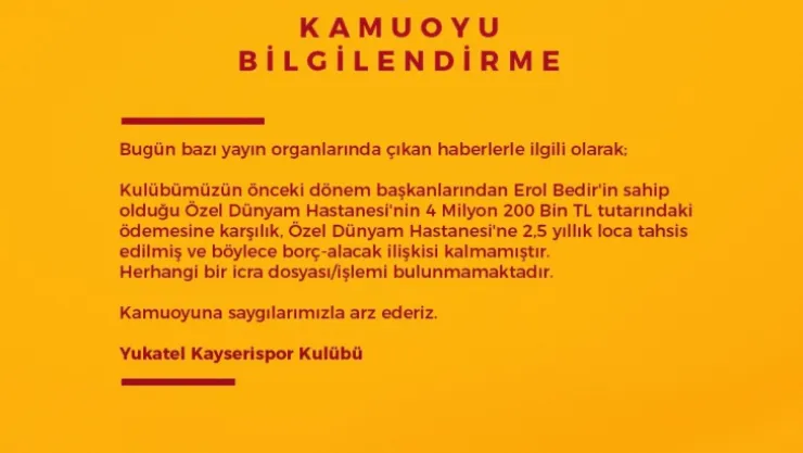 Kayserispor Kulübü, eski başkan Erol Bedir’in sahibi olduğu özel bir hastanenin 4 milyon 200 bin TL’lik alacağına karşılık loca satışı gerçekleştirdi. Sarı kırmızılı kulüpten yapılan açıklamada; "Kulübümüzün önceki dönem başkanlarından Erol Bedir’in sahip olduğu Özel Dünyam Hastanesi’nin 4 Milyon 200 Bin TL tutarındaki ödenmesine karşılık Özel Dünyam Hastanesi’ne 2,5 yıllık loca tahsis edilmiş ve böylece borç-alacak ilişkisi kalmamıştır. Herhangi bir icra dosyası/işlemi bulunmamaktadır. Kamuoyuna saygılarımızla arz ederiz" denildi.