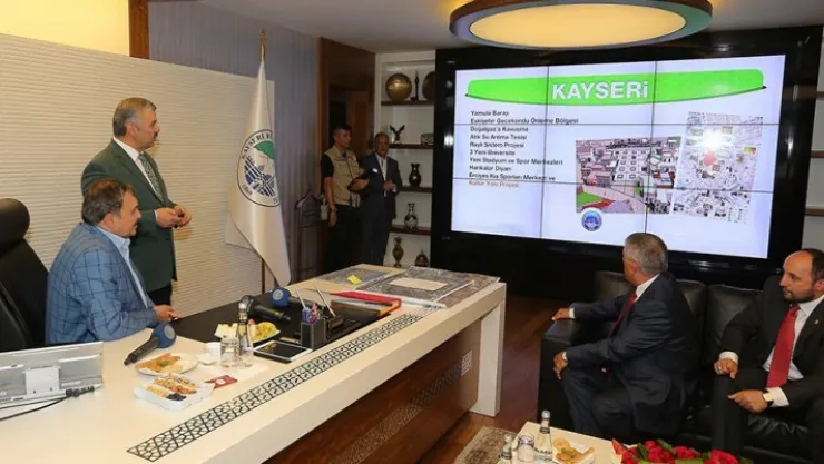 Orman ve Su İşleri Bakanı Veysel Eroğlu, Çevre ve Şehircilik Bakanı Mehmet Özhaseki ile birlikte Büyükşehir Belediye Başkanı Mustafa Çelik'i ziyaret etti. Ziyarette Belediye Meclis Salonu'nda bir yatırım toplantısı yapan Eroğlu, Kayseri'de 2019 yılına kadar çok büyük yatırımlar yapacaklarını belirtti.