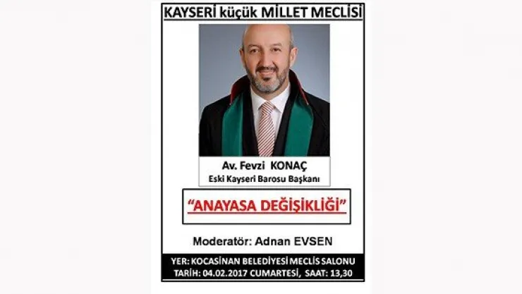 Kayseri Barosu eski Başkanı Av. Fevzi Konaç Kayseri küçük Millet Meclisi (KkMM) şubat ayı buluşmasına konuşmacı olarak katılacak. Meclisin il temsilcisi Adnan Evsen'in moderatörlüğünde yapılacak olan program cumartesi günü saat:13.30'da Kocasinan Belediyesi Konferans salonunda gerçekleştirilecek.