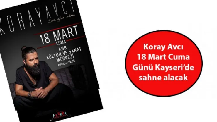Koray Avcı, 18 Mart Cuma günü saat 19.00'da Kayseri Büyükşehir Belediyesi Kültür ve Sanat Merkezi’nde konser verecek. Konserin bilet satışları Gönül Kahvesi (Kayseri Forum), Gönül Kahvesi (Alparslan), İnce Belli Kafe (Talas), Akuamarin (Sivas Caddesi) noktalarında devam ediyor.