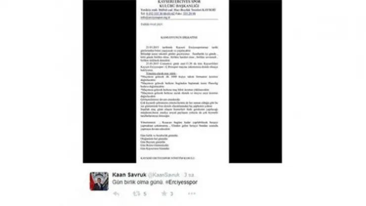 Suat Altın İnşaat Kayseri Erciyesspor Kulübü Basın Sözcüsü Kaan Savruk, Twitter hesabından Çaykur Rizespor maçı için taraftar kampanyası düzenlediklerini açıkladı.