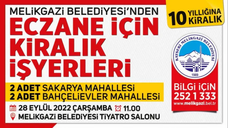 Sakarya ve Bahçelievler Mahallesi'nde Mülkiyeti Melikgazi Belediyesi'ne ait olan 4 adet eczane yeri 28 Eylül Çarşamba günü açık artırma usulüyle 10 yıllığına kiraya verilecek.