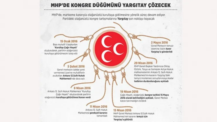 MHP'li muhalifler Ankara'da 912 delegeyi toplamasına rağmen kurultayı yapamadı. Gözler şimdi Yargıtay'ın 'Mayıs içinde açıklama yapacağız' sözüyle gün belirtmediği açıklamayı bekliyor. MHP Kayseri Milletvekili Yusuf Halaçoğlu, delegelerin noter tasdikli imzayla verdiği kurultay isteklerine rağmen Yargıtay'ın aldığı kararın hukuk dışı olduğunu söyledi. Halaçoğlu'nun okuduğu ortak bildiride, "Hiç kimse boşuna heveslenmesin, avuçlarını ovuşturmasın. MHP sahipsiz değildir. Son sözü genel başkanlar değil, kurultaylar söyler" ifadesine yer verildi.
