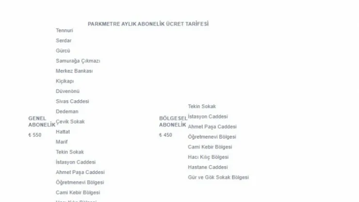 OTOPARK ADI                      GÜNLÜK ÜCRET             AYLIK ABONELİK