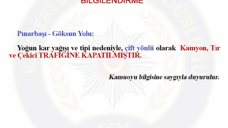 Kayseri İl Emniyet Müdürlüğü Trafik Denetleme Şube Müdürlüğü'nün hava ve yol durumu hakkında yapmış olduğu bilgilendirmelere göre; Pınarbaşı-Göksun Karayolu yoğun kar yağışı ve tipi nedeniyle kamyon, tır ve çekici türü araçların geçişine izin verilmeyecek şekilde trafiğe kapatıldı.