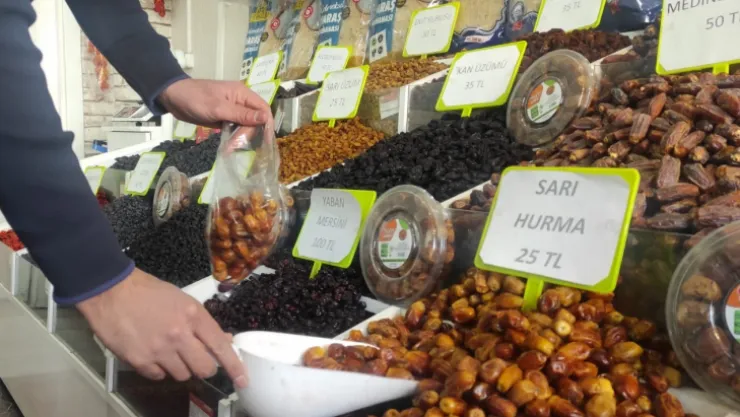Oruç ayı Ramazan’a sayılı günler kala vatandaşlarda da Ramazan telaşı başladı. İftar sofralarının olmazsa olmazı hurma ve hoşaflık ürünlerin satışları da arttı. Esnaflık yapan Eyüp Çakmak, hurma tercihleri ve fiyatları hakkında bilgi verdi. Hurma ve hoşaflık ürünlerin rağbet gördüğünü anlatan Çakmak, “Ramazan ayının yaklaşmasıyla beraber hurmaya olan ilgi de arttı. 25 liradan başlayıp 140 liraya kadar çıkabilen hurma çeşitlerimiz var. Yumuşak hurma sevenler için Kudüs hurması var. Şu anda 100 liraya satıyoruz, Ramazan ayına özel kampanyamız var. Hoşaflık ürünlerimiz de mevcut ve son günlerde ilgi arttı. Kayısı ve üzüm ön planda. Ramazan ayı yaklaştıkça satışlarımız daha da artış göstermeye başladı. Orucun ilk haftası daha da ilgi olacaktır ve satışlarımız yüksek olur” dedi.