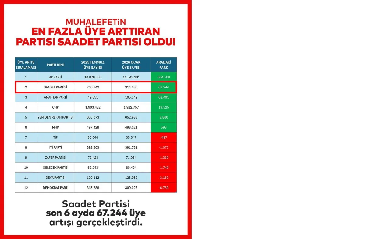Yargıtay'ın açıkladığı resmi verilere göre, Saadet Partisi, muhalefet partileri arasında en fazla üye artışını sağlayan siyasi parti oldu.