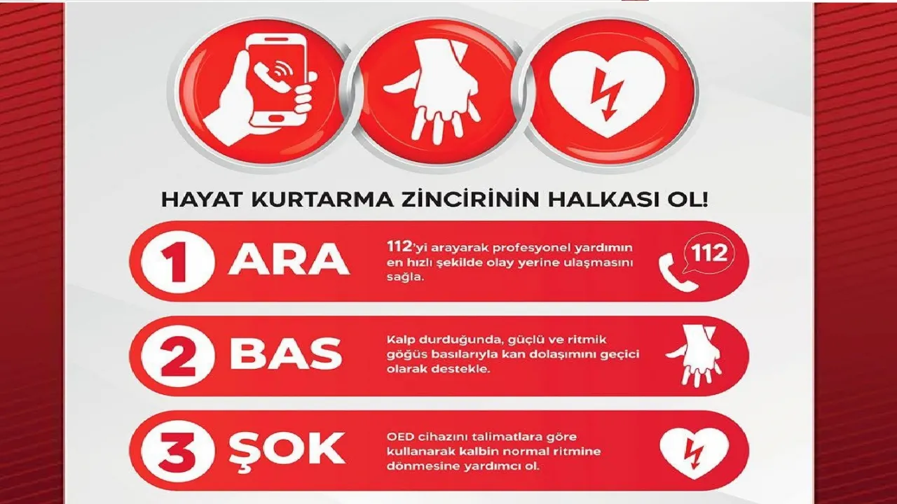 Sağlık Bakanlığı, 1-7 Aralık Acil Sağlık Haftası kapsamında vatandaşlara “hayat kurtarma zincirinin bir parçası olma” çağrısında bulundu. Yapılan açıklamada, “112'yi arayarak profesyonel yardımın en hızlı şekilde olay yerine ulaşmasını sağla. Kalp durduğunda, güçlü ve ritmik göğüs basılarıyla kan dolaşımını geçici olarak destekle. OED cihazını talimatlara göre kullanarak kalbin normal ritmine dönmesine yardımcı ol” ifadeleri kullanıldı.