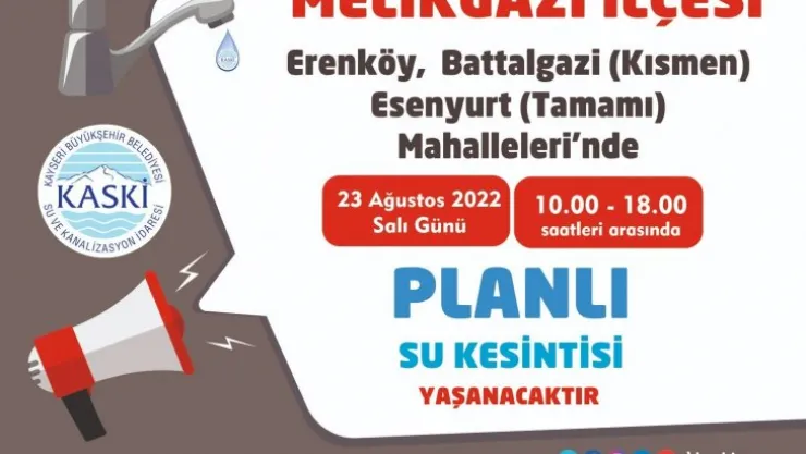 Kayseri'nin Melikgazi ilçesine bağlı Erenköy, Battalgazi ve Esenyurt Mahallelerinde kısmen su kesintisi yaşanacak.