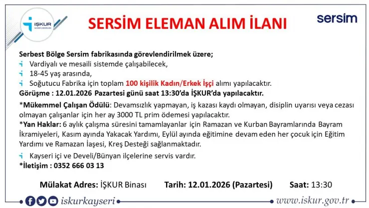 İŞKUR Kayseri, Serbest Bölge SERSİM fabrikasına 100 kişilik kadın/erkek olmak üzere işçi alınacağını duyurdu. Görüşmeler 12 Ocak Pazartesi günü saat 13:30’da İŞKUR’da gerçekleştirilecek.