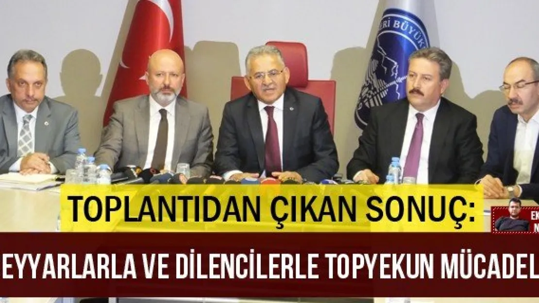 Toplantı sonrasında Büyükşehir Belediye Başkanı Dr. Memduh Büyükkılıç’ın ve Melikgazi Belediye Başkanı Mustafa Palancıoğlu, Kocasinan Belediye Başkanı Ahmet Çolakbayrakdar, Talas Belediye Başkanı Mustafa Yalçın, Kayseri Ticaret Odası Başkanı Ömer Gülsoy, Kayseri Esnaf ve Sanatkarlar Kredi ve Kefalet Kooperatifi Başkanı Mustafa Alan, Kayseri Sebze ve Meyve Komisyoncuları Dernek Başkanı Yüksel Garip, Kayseri Sebze ve Meyve Pazarcılar Odası Başkanı Osman Akbıyık, Esnaf Sanatkarlar Odaları Birliği Başkan Vekili Kenan Arslan ve Kayseri Sebze Meyve A.Ş. Yönetim Kurulu Başkanı Burhanettin Acar’ın imzalarının yer aldığı ortak bir bildiri de yayımlandı. İmza altına alınan ortak açıklamada şu ifadelere yer verildi: “Bu şehir hepimizin. Önemli olan halkın huzuru ve güvenliğidir. Gıda gibi çok önemli bir konuda sağlıklı olup olmadığı belli olmayan ürünlerin satılması başlı başına bir sorundur. Haksız kazanca ve haksız rekabete sebebiyet vermek ve kayıt dışının artmasına vesile olmak şehrimize yapacağımız en büyük kötülük olacaktır. Bu doğrultuda haksız rekabet yapan seyyarlarla ve duygu sömürüsü yapan dilencilerle mücadele sadece belediyeler bünyesindeki zabıta birimlerinin değil, tüm halkımızın sorunu ve sorumluluğudur. Bu sorumluluğun yerine getirilmesi vatandaşlık görevidir. Bizler Kayseri’mizi seviyoruz ve bu şehrin çok daha düzenli bir şehir olmasını istiyoruz. Bu nedenle de topyekun seyyarlarla ve dilencilerle mücadele etmeyi bir görev biliyoruz. Halkımızın da bizlere bu konularda destek vermesini istiyoruz. Kamuoyuna saygıyla duyururuz.”
