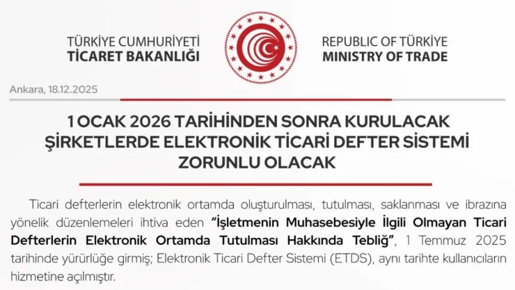 Ticaret Bakanlığı tarafından 1 Ocak 2026 tarihinden sonra kurulacak şirketlerde elektronik ticari defter sisteminin zorunlu olacağını duyuruldu. Yapılan açıklamada, “Ticari defterlerin elektronik ortamda oluşturulması, tutulması, saklanması ve ibrazına yönelik düzenlemeleri ihtiva eden "İşletmenin Muhasebesiyle İlgili Olmayan Ticari Defterlerin Elektronik Ortamda Tutulması Hakkında Tebliğ", 1 Temmuz 2025 tarihinde yürürlüğe girmiş; Elektronik Ticari Defter Sistemi (ETDS), aynı tarihte kullanıcıların hizmetine açılmıştır. Tebliğ hükümleri uyarınca; genel kurul toplantı ve müzakere defteri ile pay defterini elektronik ortamda tutma yükümlülüğü kapsamında olan, kuruluşu ve esas sözleşme değişikliği Ticaret Bakanlığı iznine tabi şirketlerin ETDS'ye geçişleri için öngörülen süre 1 Ocak 2026 tarihinde sona ermektedir. Yükümlülük kapsamındaki şirketlerin, Türk Ticaret Kanunu'nun ticari defter tutma yükümlülüğüne ilişkin gerekliliklerini yerine getirmeleri bakımından, bu tarihe kadar her iki defter yönünden ETDS'ye dahil olmaları önem arz etmektedir” denildi.